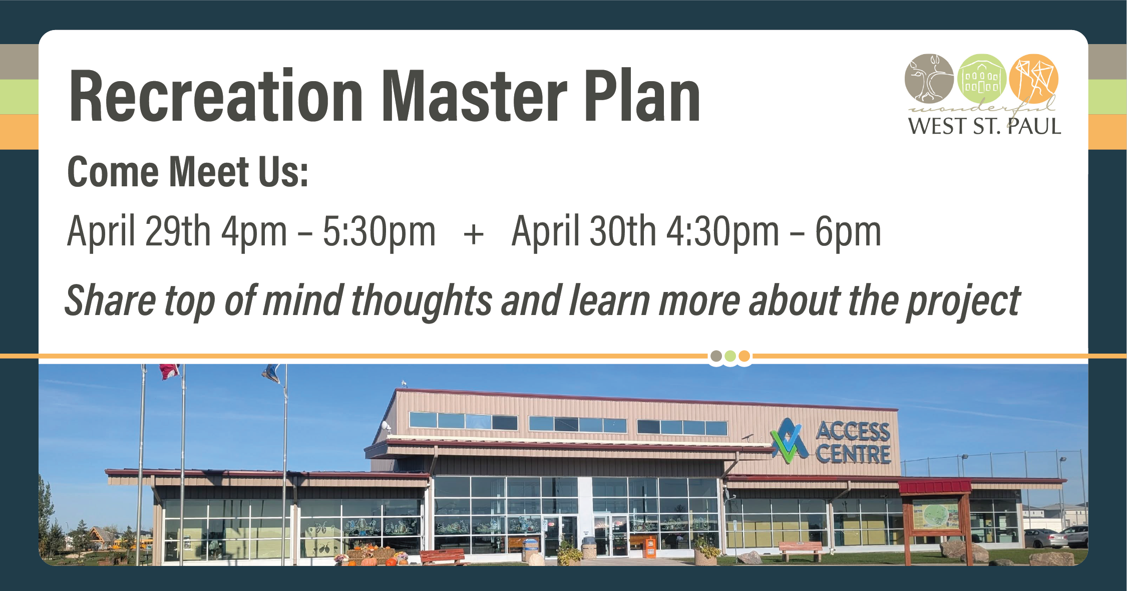 Drop by the Access Centre (48 Holland Road) on Wednesday, April 29 between 4:00 to 5:30 p.m. or Thursday, April 30 between 4:30 to 6:00 p.m. to learn more about the RM of West St. Paul Recreation Master Plan, including what we’ve heard and learned about the community so far, and share your ideas for the future of recreation.