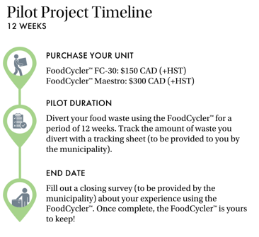 Not much! Purchase a FoodCycler™ from your municipality at a subsidized cost, track your use once a week for a period of 12 weeks and then answer a brief exit survey.